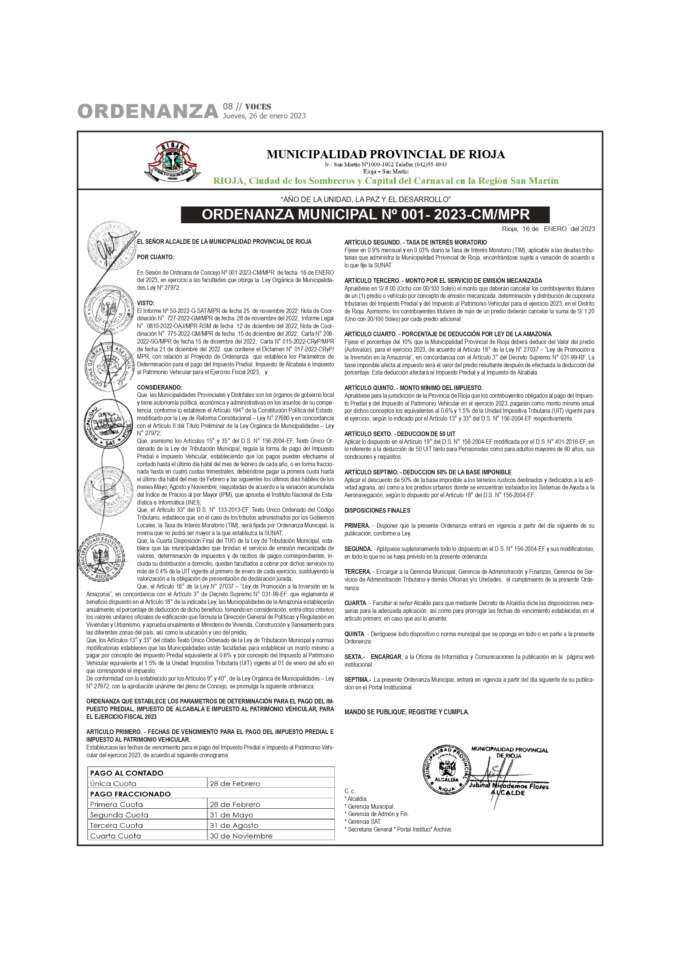 Municipalidad Provincial de Rioja: Ordenanza Municipal N° 011-2023-CM/MPR