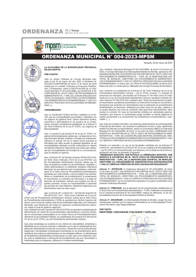 Municipalidad Provincial de San Martin: Ordenanza Municipal N° 004-2023-MPSM