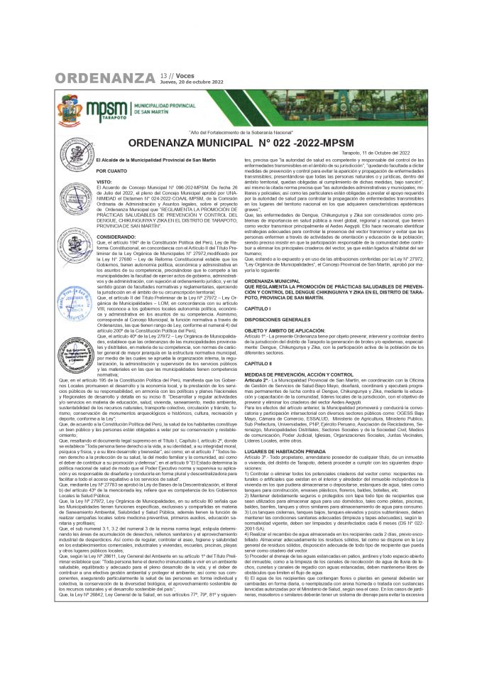 Municipalidad Provincial de San Martin: Ordenanza Municipal N° 022-2022-MPSM