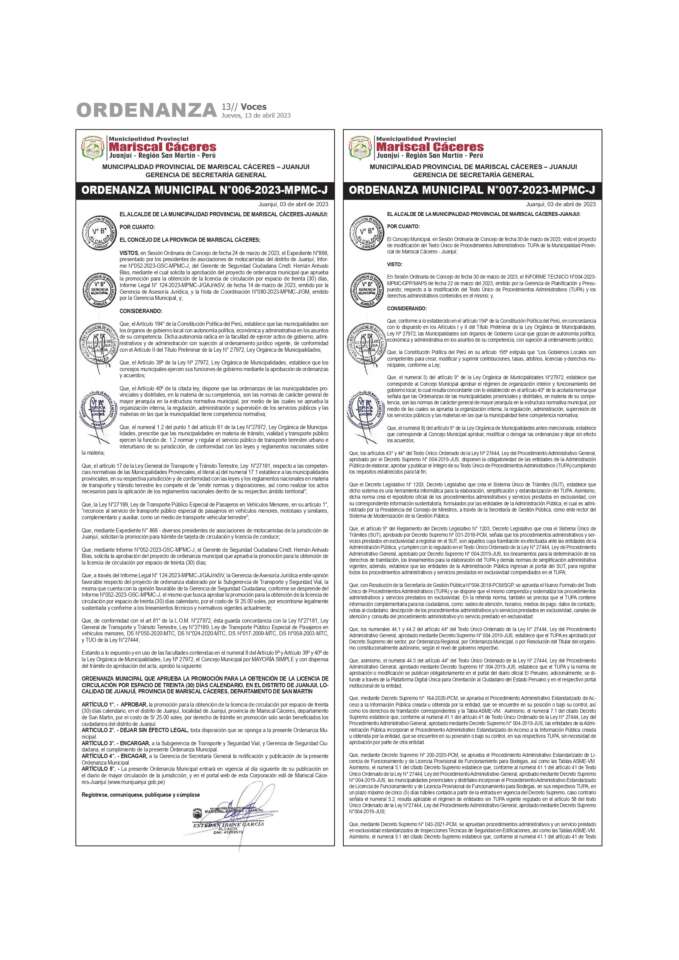 Municipalidad Provincial Mariscal Caceres: Ordenanza Municipal N° 006-2023-MPMC-J Y Ordenanza Municipal N° 007-2023-MPMC-J