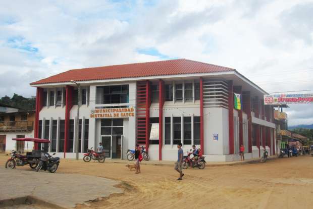Sauce. Dentro la celebración de los 81 años de creación política del distrito de Sauce el sábado 20 de mayo, la municipalidad distrital, encabezada por su alcalde Jorge Armando del Aguila Vela, su plana de regidores, funcionarios y contando con la presencia de autoridades civiles, militares y la población inauguró tres obras: Pontón vehicular sobre la quebrada de ojos en el Jr. San Martín en el barrio La Loma, un puente vehicular sobre la quebrada Upianillo en el Jr. Zaragoza, que conduce al cementerio general de la ciudad y el moderno Palacio Municipal de dos pisos.