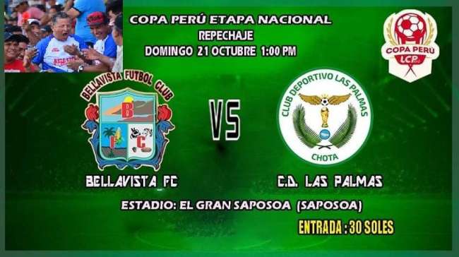 Mañana a las 13 horas, la escuadra de Bellavista FC sub campeón departamental de San Martín, luego de subsanar ciertas observaciones y con advertencia a su hinchada, volverá a jugar en el estadio La Gran Saposoa frente a Las Palmas de Chota. Este choque es válido por el partido de ida de los 8vos de final de repechaje Copa Perú 2018.