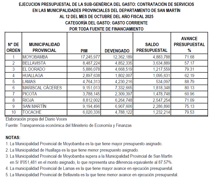 El promedio de ejecución presupuestal en la contratación de servicios de las diez municipalidades provinciales de San Martín bordea el 72%, cifra que, si bien refleja un nivel aceptable de gasto, también advierte que cerca del 28% del presupuesto total —unos S/ 17 millones aproximadamente— permanece sin ser utilizado.