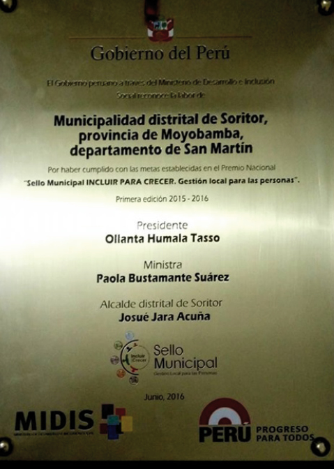 El municipio de Soritor representado por su alcalde Josué Jara Acuña fue galardonado con el premio denominado «Sello Municipal incluir para crecer, gestión local para las personas» galardón que dispuso entregar el gobierno central a las municipalidad destacadas del país, por haber desarrollado al 100% los indicadores establecidos en el cumplimiento de metas durante los últimos 10 meses.