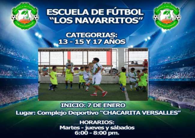 ¡Confirmado! Las categorías 13, 15 y 17 años de la escuela de fútbol Los Navarritos entrenarán desde este martes 7 de enero en la cancha sintética del Complejo Deportivo Chacarita Versalles tras llegar a un acuerdo con la administración de la Municipalidad Provincial de San Martín. El día en que hará uso de este recinto deportivo serán los días martes y sábado de 6:00pm a 8:00 pm. Por lo que los niños que se han inscrito en estas categorías tendrán que acercarse el martes 7 de los corrientes a la cancha de partido alto, donde el técnico deportivo Fernando Navarro está listo para iniciar este hermoso proyecto.