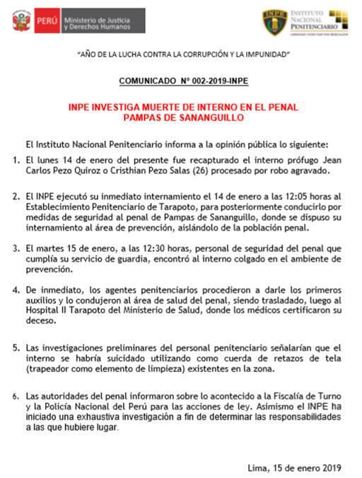 Tras la muerte de Cristian Pezo Salas, el Instituto Nacional Penitenciario-INPE, emitió un comunicado donde señalaba que la muerte del interno en mención se debió a un suicidio cuando éste se encontraba en la sala de prevención ayudado con retazos hecho soga de un trapeador que se encontraba junto a él.