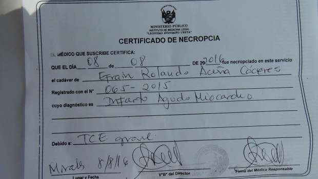 El resultado de la autopsia practicada al cuerpo del conductor del ómnibus de la empresa de transportes Móbil bus, revela que murió a consecuencia de un infarto agudo al miocardio, debido a un traumatismo encéfalo craneano grave, a consecuencia de un accidente de tránsito ocurrido a la altura del kilómetro 666 de la carretera Fernando Belaúnde Terry, cerca del distrito de Morales.