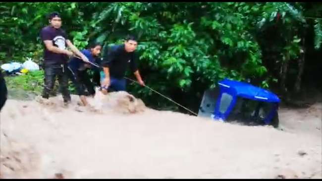 En la carretera Shapaja – Chazuta vivieron momento de tensión unos jóvenes que apoyaron en rescatar un trimóvil que el domingo fue arrasado por la corriente de una quebrada que de manera intempestiva aumentó su caudal a consecuencia de la torrencial lluvia que soportó una gran parte de la región San Martín.