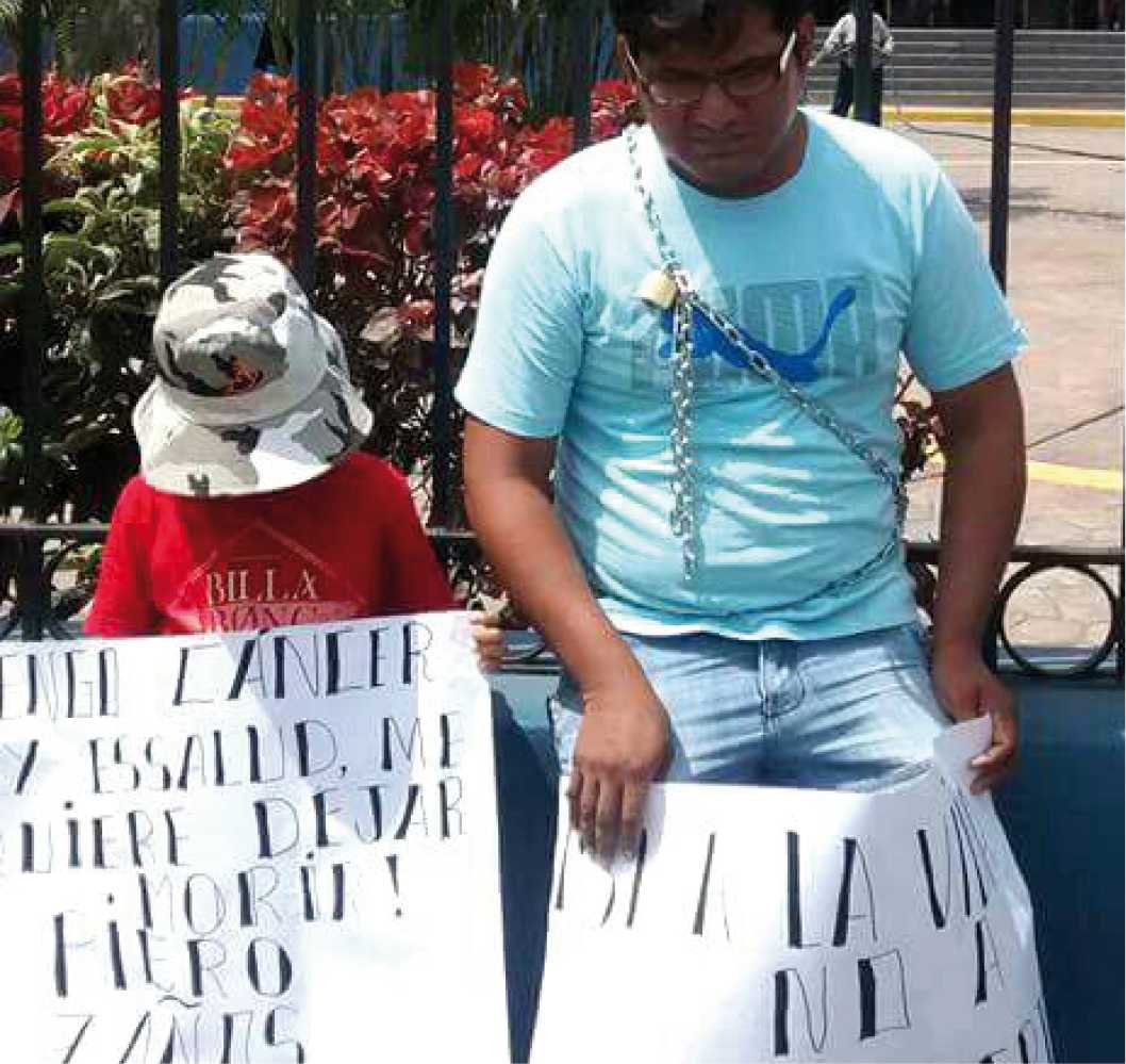 Piero Sebastián acompañó a su padre en la protesta, el menor portó un cartel que decía: “Tengo cáncer y EsSalud me quiere dejar morir”, situación que generó la atención de la prensa capitalina que en todo momento los periodistas de varios medios de comunicación informaron la singular protesta de esa familia tarapotina. (Hugo Anteparra)