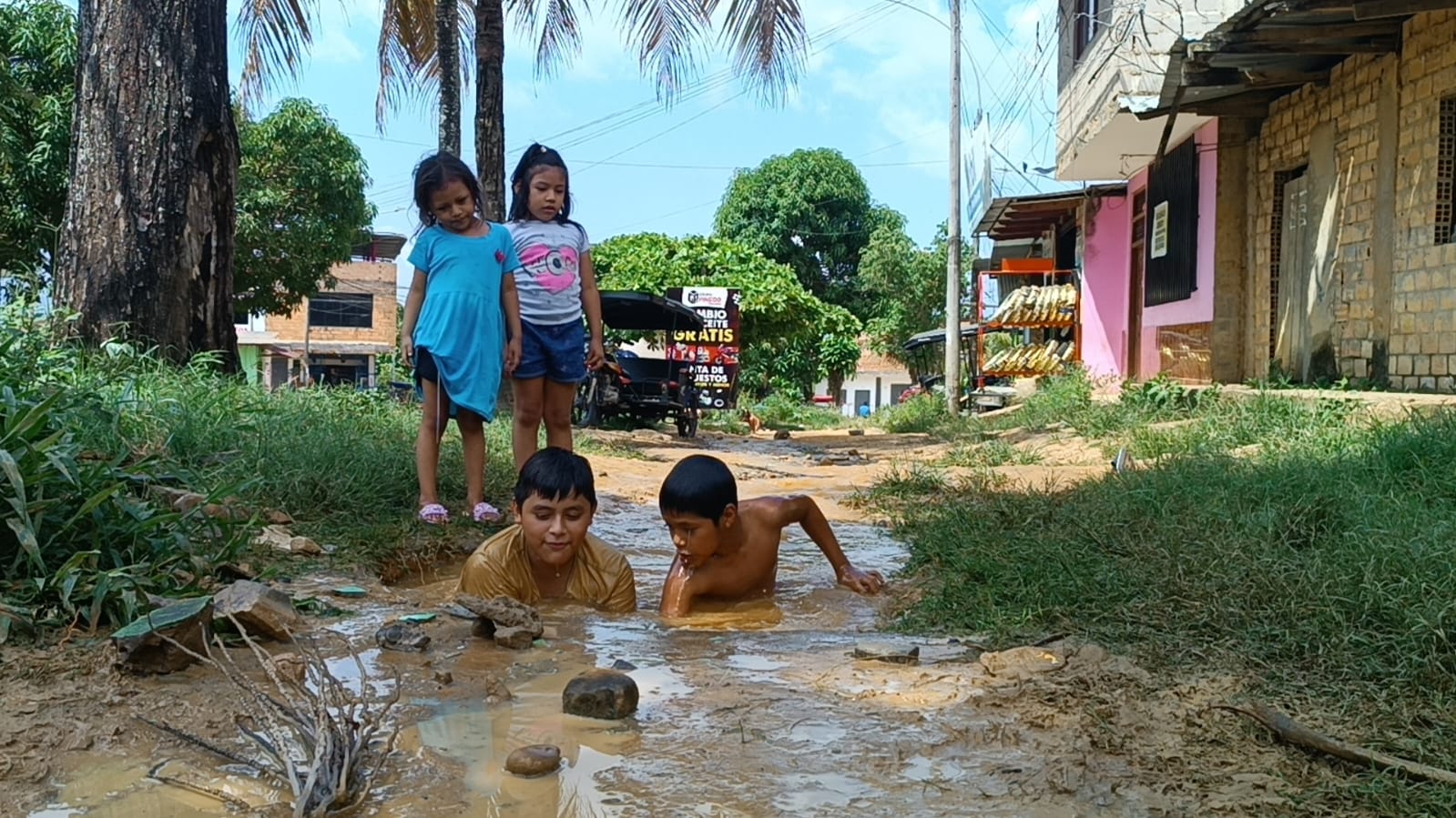 Los menores de la cuadra 12 del jirón Excarretera Yurimaguas lo convirtieron en una piscina natural para darse un chapuzón tras el fuerte verano que afecta la ciudad.