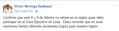 Uno de las primeras publicaciones que hizo, fue que no iba poder escuchar al FEDEIMAM el 8 de febrero, porque tiene una cita con el Gore Ejecutivo en Lima, donde asistirá acompañado de sus gerentes.