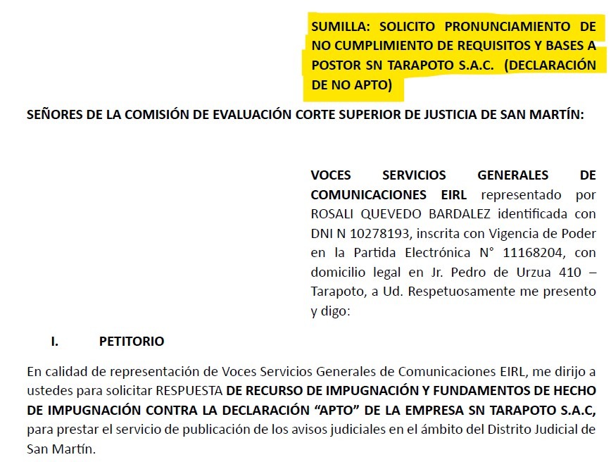 La empresa VOCES Servicios Generales de Comunicaciones E.I.R.L., representada por Rosali Quevedo Bardalez, presentó una impugnación contra la calificación de la empresa SN Tarapoto S.A.C., declarada “apta” en el proceso de selección para la prestación del servicio de publicación de avisos judiciales en el distrito judicial de San Martín.