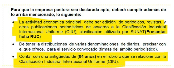 El Término de Referencia elaborado por la misma Comisión establece expresamente que, para ser declarada apta, la empresa debe acreditar una antigüedad mínima de cuatro (04) años en el rubro o contar con un registro relacionado con la Clasificación Industrial Internacional Uniforme (CIIU) en la SUNAT.