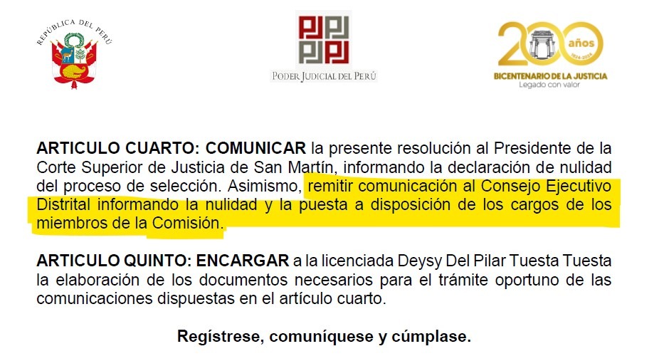 La Comisión del Proceso de Selección del Diario Judicial de la Corte Superior de Justicia de San Martín (CSJSM) declaró nula la tercera convocatoria para la designación del Diario Judicial correspondiente al periodo 2025–2026, tras detectar vacíos y ambigüedades en los Términos de Referencia (TDR) que ellos mismos crearon indicando que afectaban la legalidad del procedimiento y los derechos de los postores.