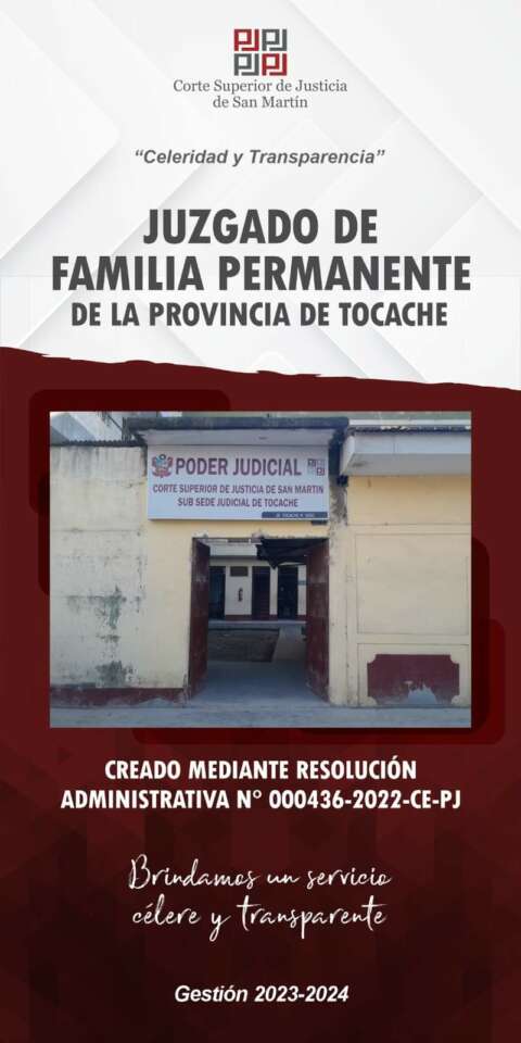 A partir del viernes 23 de junio, empezará a funcionar el Juzgado de Familia Permanente de la provincia de Tocache. La ceremonia de inauguración se realizará en la sede de este nuevo juzgado que se ubica en el Jr. Esteban Delgado Esquina con Sara Anita-Tocache, la misma que estará encabezada por el presidente de la Corte Superior de Justicia de San Martín, Walter Francisco Ángeles Bachet.
