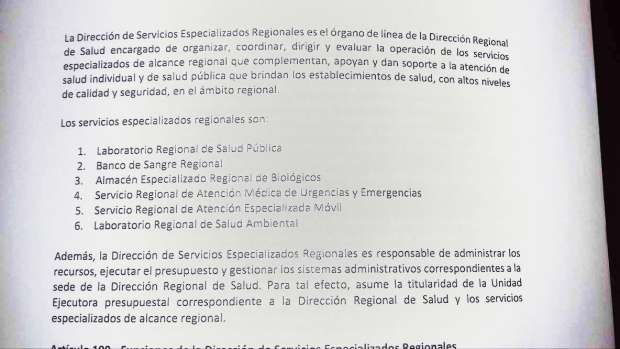 El Art. 189 del nuevo modelo de gestión en salud cambia el modelo antiguo manual a uno automatizado, que funcionará en red para el manejo de los servicios especializados regionales como; el Laboratorio Regional de Salud pública, el banco de Sangre, Almacén Regional especializado de biológicos, servicio regional de atención médica de urgencias y emergencias, servicio regional de atención especializada móvil y laboratorio regional de salud ambiental. Además la dirección de servicios especializados regionales asume como unidad ejecutora presupuestal de la Dirección Regional de Salud y de los servicios especializados de alcance regional.
