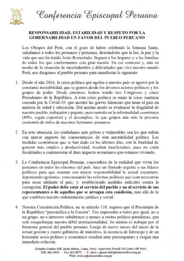 La Conferencia Episcopal Peruana, en representación de los obispos del Perú, pidió hoy al presidente de la República y a los 130 congresistas que asuman su responsabilidad para la cual han sido elegidos ante la crisis que desde el 2016 agobia a nuestro país por “la constante inestabilidad, que se genera desde los diversos actores políticos y los grupos de poder”.