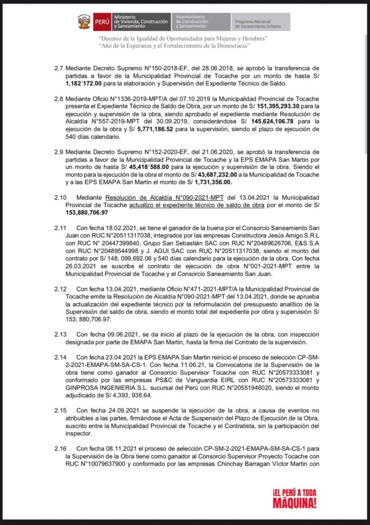Pese a las recientes declaraciones del gerente de la Municipalidad Provincial de Tocache, quien afirmó que el proyecto de agua potable y alcantarillado se encuentra en la etapa final del expediente técnico y con financiamiento asegurado, documentos oficiales del Programa Nacional de Saneamiento Urbano (PNSU) revelan una realidad distinta.