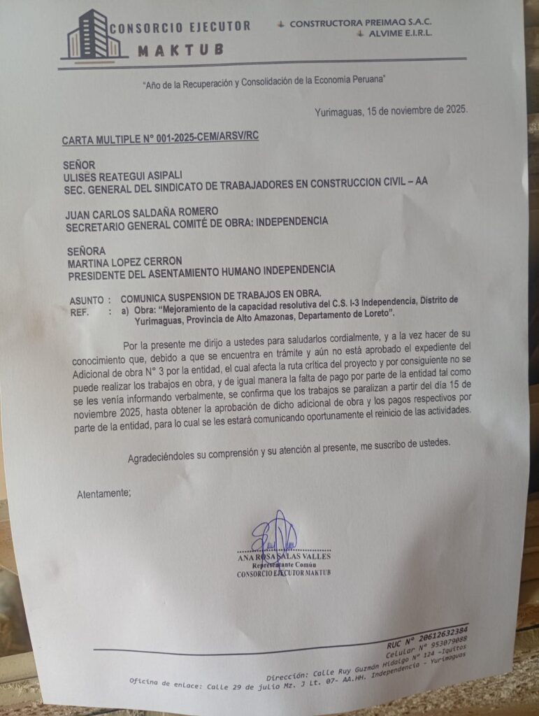 La paralización de importantes obras públicas en la provincia de Alto Amazonas vuelve a encender las alertas en el sector construcción y entre la ciudadanía. El Consorcio encargado de ejecutar el Centro de Salud Independencia, en Yurimaguas, informó la suspensión total de los trabajos desde el 15 de noviembre, afectando directamente el avance de un proyecto considerado prioritario para la zona.