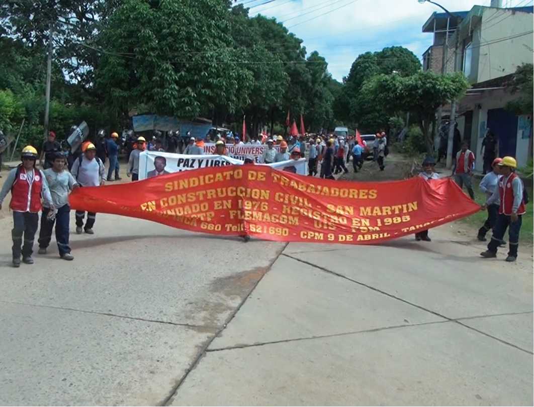 Obreros de diferentes partes de la región llegaron a Tarapoto para participar de la movilización que se inició en la Concha Acústica desde donde recorrerieron las principales calles de la ciudad acompañados por un contingente policial de la Unidad de Servicios Especiales. La plataforma de lucha que reclaman tiene once puntos.