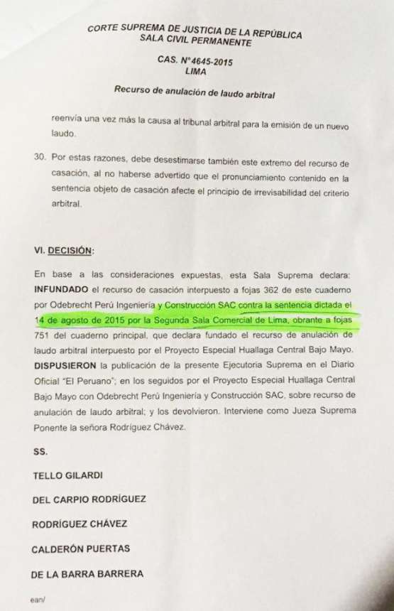 El 2 de junio, la Corte Suprema declaró infundado el recurso de casación interpuesto por Odebrecht Perú Ingeniería y Construcción SAC contra la referida sentencia. Con esta decisión judicial, el Gobierno Regional no entregará 25 millones 922,630 soles pretendidos por el consorcio brasileño a través del cuestionado arbitraje.