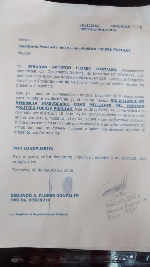 Oficialmente, Segundo Flores Gonzales, dejó de pertenecer al partido Fuerza Popular, presentando su carta de renuncia al Secretario General Provincial de esa agrupación Ronald del Castillo Flores, el 28 de agosto, siendo recibida, los primeros días de setiembre.