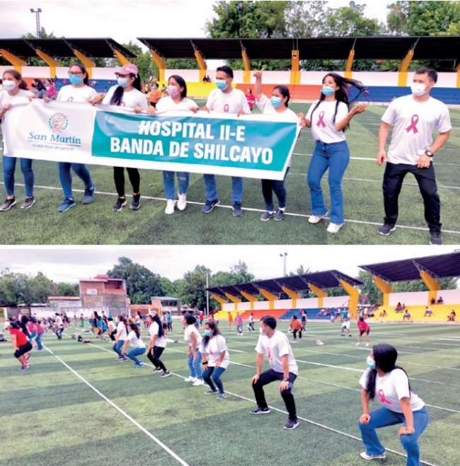 Promoviendo los estilos de vida saludables desde la práctica de la actividad física, médicos, obstetras, enfermeros y técnicos asistenciales y administrativos, participaron en el Baileton organizado por la MPSM luciendo en sus polos el lazo conmemorativo de la lucha contra el cáncer, recordándonos que solo se reduce el riesgo de los canceres, con alimentación saludable, actividad física realizada regularmente y evitando el consumo y exposición al tabaco, alcohol y derivados.