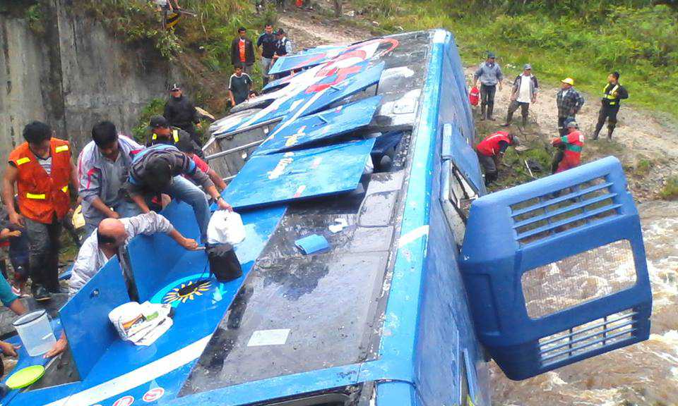 Cinco muertos y más de 30 personas heridas es el saldo de un accidente de tránsito ocurrido la tarde del jueves a la altura del kilómetro 342 de la carretera Fernando Belaúnde Terry, los sobrevivientes indicaron a la Policía de Carreteras que el ómnibus de la empresa de transportes GH Bus intentó pasar a un camión cerca al puente Vilcaniza, situación que motivó el despiste.