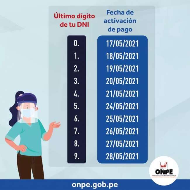 Las fechas de pago dependen del último dígito del Documento Nacional de Identidad (DNI) del miembro de mesa. Si la última cifra es cero, podrá cobrar el lunes 17 de mayo; si es 1, el martes 18; y así sucesivamente, sin contar el sábado, hasta llegar a los ciudadanos con DNI terminado en 9, a quienes les corresponde retirar el monto el viernes 28 de mayo.
