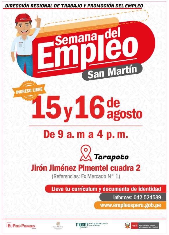 Con motivo de conmemorarse la Semana del Empleo en San Martín, una serie de actividades se vienen desarrollando promovidas por el Gobierno Regional de San Martín mediante la Dirección Regional de Trabajo y Promoción del Empleo.