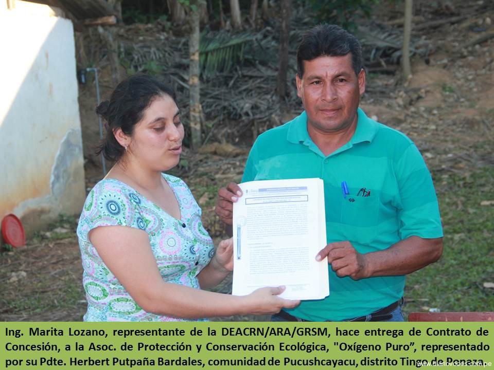 La Dirección Ejecutiva de Administración y Conservación de los Recursos Naturales ARA/GORESAM, entregó el fin de semana, el contrato de concesión con fines de conservación por 40 años, a la Asociación de Conservación y Protección Ecológica Oxígeno Puro, ubicada en la jurisdicción del distrito de Tingo de Ponaza, provincia de Picota, departamento de San Martín.