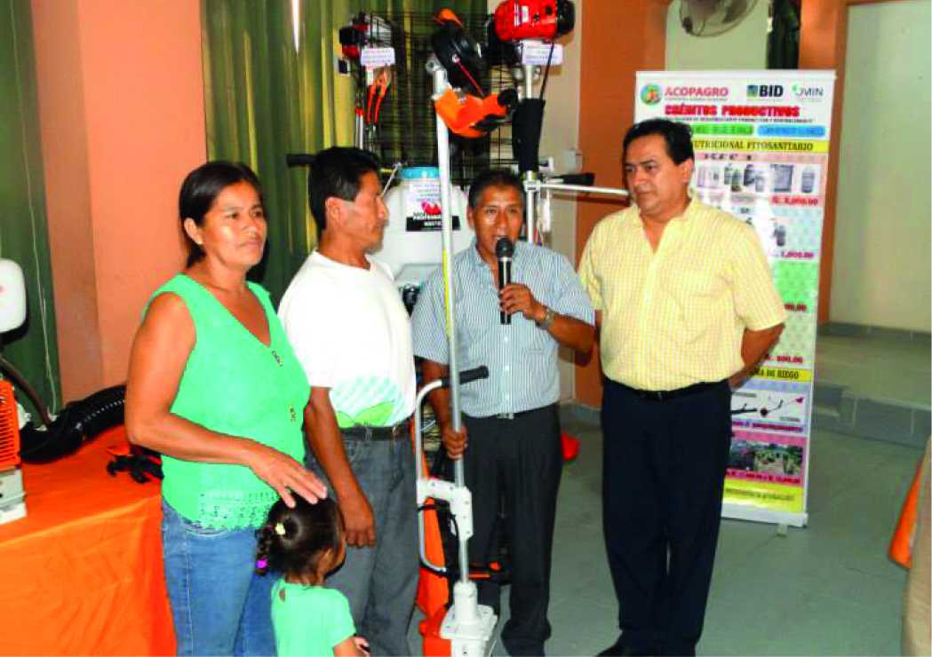 Linder Guerra Tuanama, modesto productor de la comunidad de Bagazán, distrito de Pachiza fue el socio que recibió el primer crédito productivo por parte del directivo Jaime Laimito Quispe, consistente en una motoniveladora y pulverizadora, herramientas que según apreció emocionado Guerra Tuanama, le ayudarán a ahorrar tiempo y dinero en su parcela.