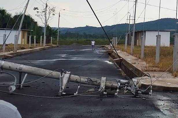 La tarde de ayer domingo, fuertes vientos afectaron los postes del servicio de electricidad en Media Tensión, el impacto del fenómeno natural impacto con fuerza en el en el Sector Las Palmeras del Golf, urbanización ubicada en la carretera Cacatachi – Lamas.