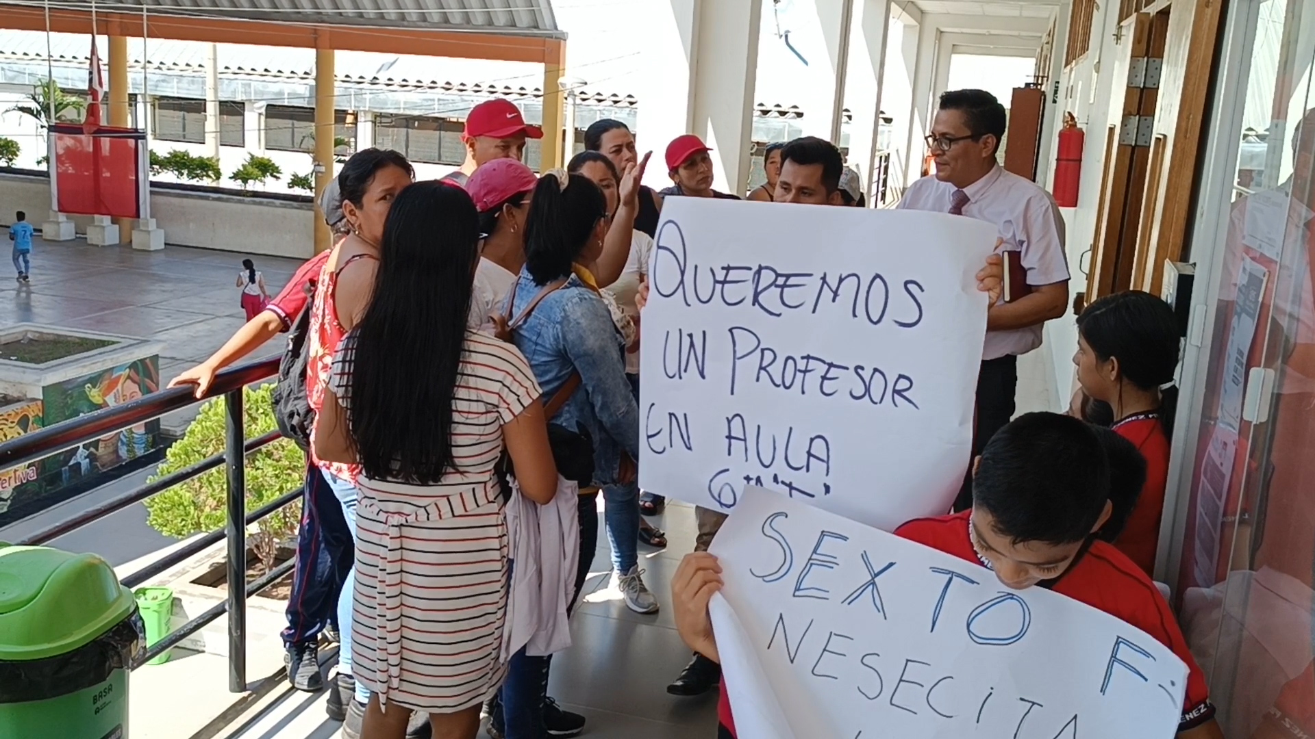 Ayer por la mañana un grupo de padres de familia pertenecientes al sector grado de la sección «F» de la Institución Educativa «Juan Jiménez Pimentel» de Tarapoto protestaron frente a la dirección del plantel exigiendo la asignación inmediata de un docente para sus hijos, quienes están sin recibir clases desde el inicio del año escolar.
