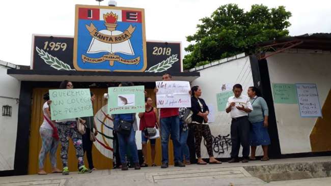 Un grupo de padres de familia de la Institución Educativa Santa Rosa de Tarapoto, ayer por la mañana realizó una protesta rechazando el posible regreso del exdirector, profesor Marcovic Ríos Chumbe, quien el año pasado fue separado del colegio sindicado de presuntos malos manejos.