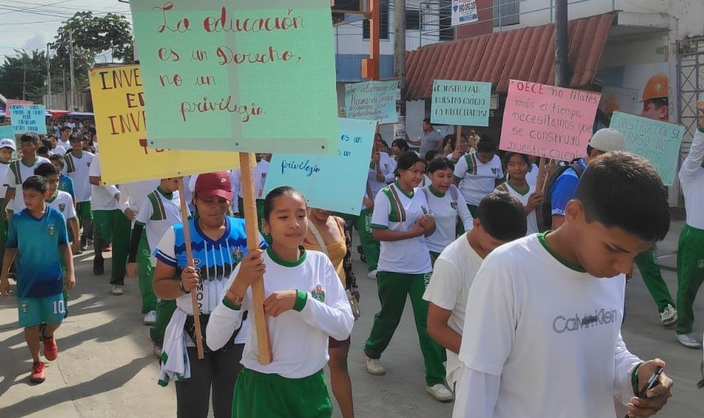 Padres de familia y estudiantes del Colegio Héroes del Cenepa de Juanjuí realizaron una movilización por las principales calles de la ciudad y un plantón frente a la Gerencia Territorial Huallaga Central, sede del Gobierno Regional de San Martín, para exigir la construcción de una nueva infraestructura educativa.