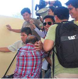Se empecinó Servando Soplapuco iniciando un espectáculo lamentable, en el que los jóvenes le cerraban el paso en sus repetidos ingresos de querer ingresar a las oficinas, mientras que él los empujaba. No hubo violencia en su contra por parte de los estudiantes, quienes solo pedían que se retire.