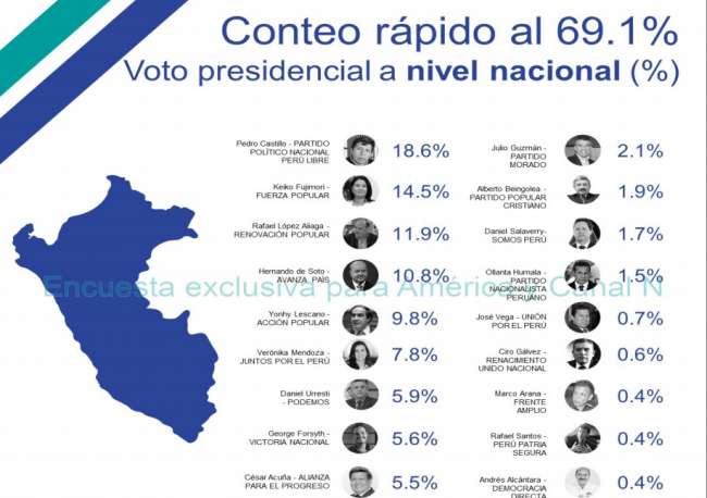 El flash electoral de América TV / Ipsos indica que el candidato de Perú Libre, Pedro Castillo, alcanzó el 18,6% de votos, seguido de Keiko Fujimori, de Fuerza Popular (14.5%); Rafael López Aliaga, de Renovación Popular (11.9, %) Hernando de Soto, de Avanza País (10,8%) Yonhy Lescano, de Acción Popular (9.8%) y Verónika Mendoza, de Juntos Por el Perú (7,8%).