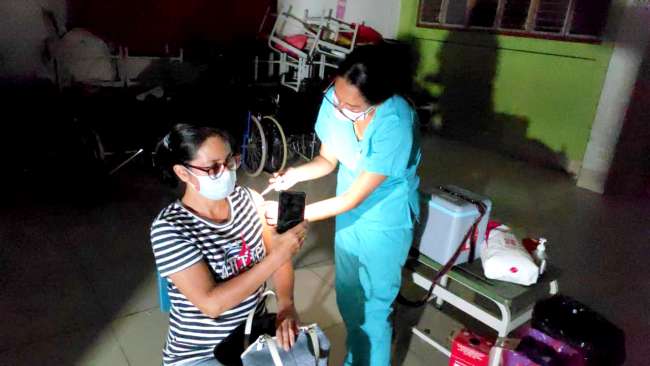 Ayer por la noche una avería en el sistema eléctrico dejó en tinieblas la Institución Educativa Jiménez Pimentel de Tarapoto, en momentos que decenas de personas esperaban turno para recibir su primera dosis de la vacuna contra el Covid – 19. A pesar de la situación, personal de Salud continuó con su labor alumbrándose con teléfonos celulares para poder inocular a los adultos mayores de 40 años de edad.