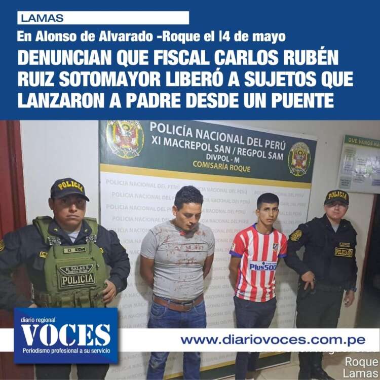 Indignante. Dos sujetos que robaron y lanzaron de un puente peatonal a un adulto mayor la región San Martín, fueron liberados por un fiscal; los dos sujetos acusados del condenable hecho fueron capturados por el hijo de la víctima y pobladores de la zona tras perseguirlos por los caseríos cercanos. Agentes de la Policía Nacional llegaron instantes después de la captura de los delincuentes y los trasladaron hacia la comisaría del sector. Los sujetos identificados como Neyser Villalovos Cortina y Humbert Sánchez Romero, ambos de 28 años