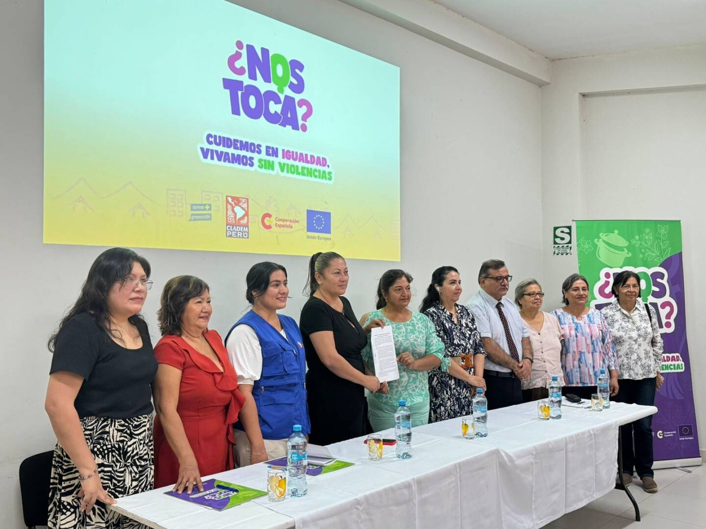 Se contó con la presencia de Lisbeth Guillén de CLADEM Perú (Comité de América Latina y el Caribe para la Defensa de los Derechos de las Mujeres) y Sofía Carrillo, responsable de la campaña “¿Nos Toca?”. Precisamente la coordinadora de CLADEM Perú, Clea Guerra, informó que desde la organización que representa y sus asociadas seguirán reflexionando en distintos lugares del país, y demandando al Estado para que se garantice el derecho al cuidado e implementen políticas de prevención y atención de violencia de género, por lo que se continuará difundiendo la campaña “¿Nos Toca?: Cuidemos en Igualdad, Vivamos sin Violencias”, que cuenta con el apoyo de la Agencia Española de Cooperación Internacional – AECID y la Unión Europea – UE.