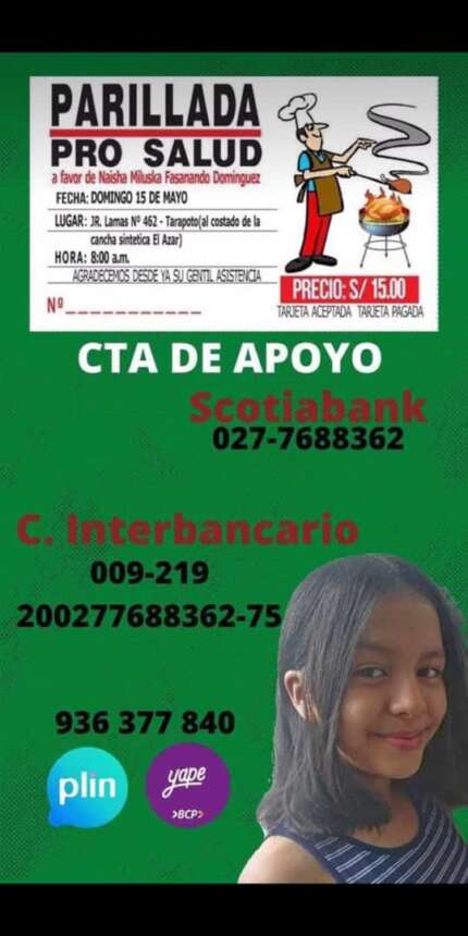 Rubí Fasanando Domínguez, es la Hermana de Naisha Miluzka Fasanando Domínguez, menor de 10 años que se encuentra 20 días internada en el hospital II-2 de Tarapoto, luego que los médicos le diagnosticaran Leucemia, motivo por el cual, cada 2 días necesitan contar con 5 unidades de sangre, actualmente viene pidiendo ayuda para poder conseguir la sangre que es O+, la misma que es carente en el Banco de Sangre Regional, como también los recursos económicos para poder adquirirlos porque algunos medicamentos no cobertura el Seguro Integral de Salud.