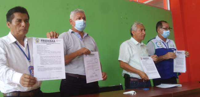 Texto de Imagen: AUTORIDADES Y PRESIDENTE DEL FREDESAA MUESTRAN DOCUMENTO DE DENUNCIA A ELECTRO ORIENTE