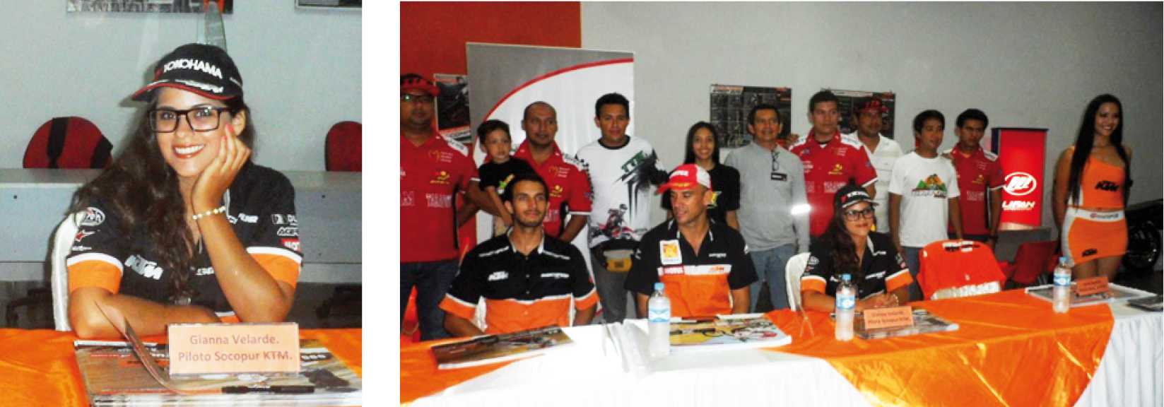 Ellos estuvieron acompañados de Kevin Ríos, representante del oriente peruano conjuntamente con Israel Borrel, pero quien se llevó la atención de los presente fue la experimentada motociclista Gianna Velarde, reconocida como la primera mujer que compite bajo la modalidad de Enduro, ella muy gentilmente atendió a todos aquellos que le solicitaron un autógrafo y una foto para el recuerdo, sin ninguna duda belleza y destreza de la mano.