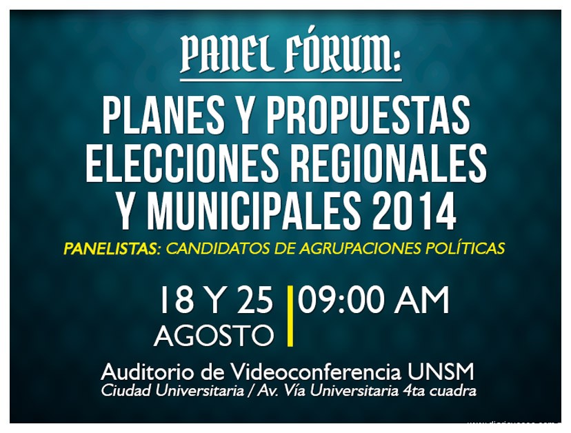 La Universidad Nacional de San Martín – Tarapoto, organiza el Panel Fórum sobre “Planes y propuestas de los candidatos al gobierno regional y a los gobiernos locales”, orientado a los que aspiran lograr la representatividad de la población de la región San Martín, quienes tratarán de lograr consensos sobre la forma efectiva y real de solucionar los problemas que nos aquejan.