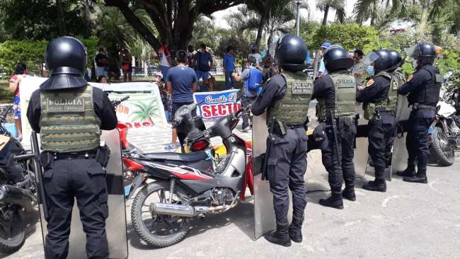 Hasta el lugar llegó un contingente policial para persuadir a los manifestantes, sin embargo, ellos continuaron firmes protestando, aduciendo que es una protesta de manera pacífica y solo acataron el distanciamiento social. Finalmente, una comitiva de dirigentes ingresó al local municipal para dialogar con las autoridades para exigir atención a sus reclamos. (Karina Roncal)