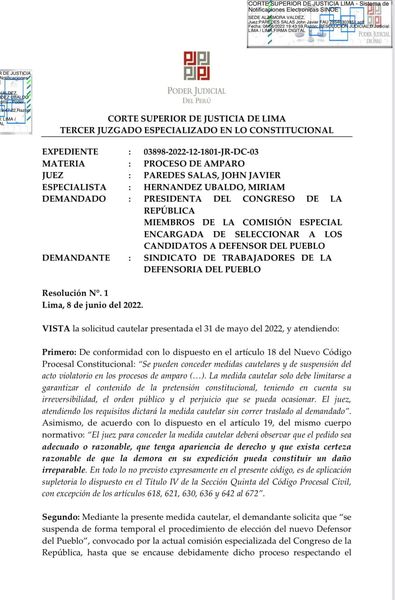 El Tercer Juzgado Especializado en lo Constitucional a cargo del magistrado John Javier Paredes Salas, ordenó al Congreso de la República, suspender el proceso de elección del nuevo Defensor del Pueblo hasta que se resuelva la acción de amparo interpuesta por el Sindicato de Trabajadores de la Defensoría del Pueblo.