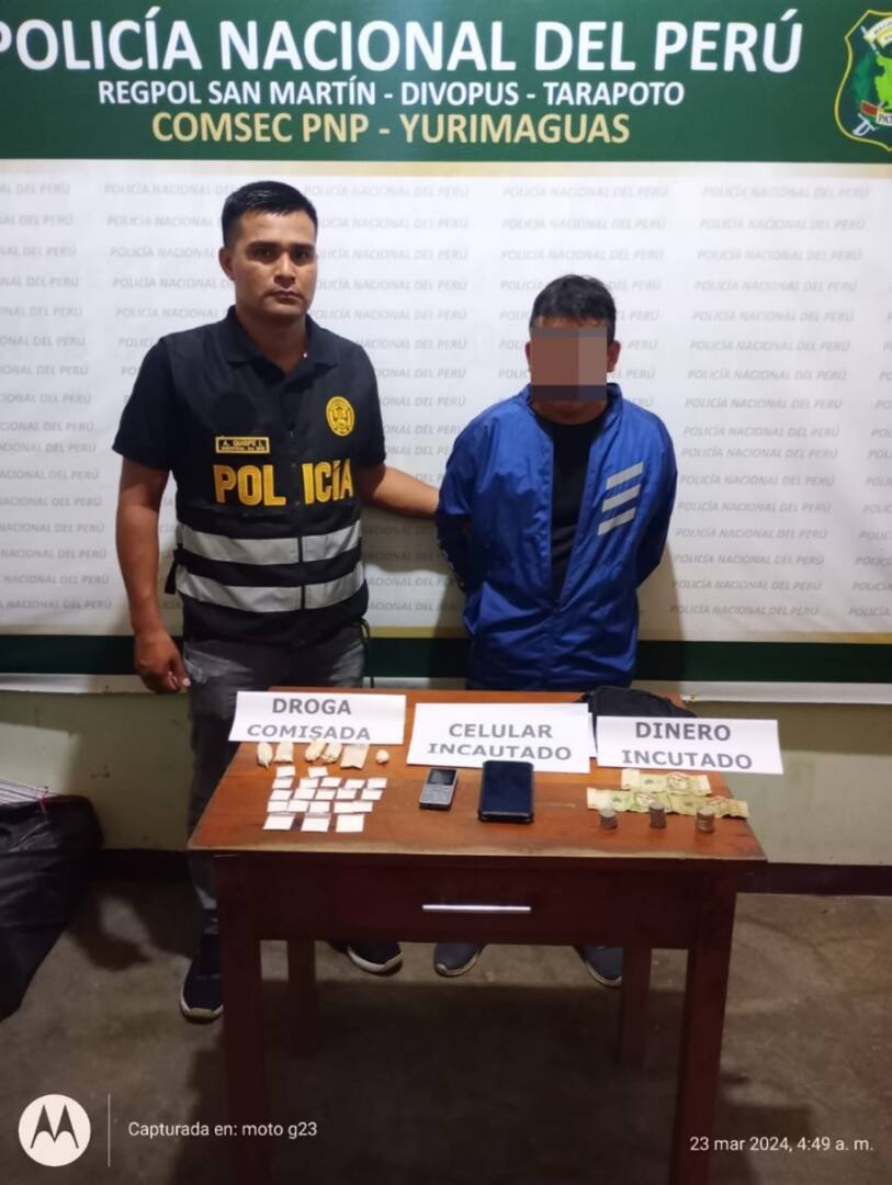 Al realizarle el registro de rigor, los agentes PNP de la comisaría de Yurimaguas encontraron en un canguro que portaba, 06 bolsitas de polietileno transparentes conteniendo Pasta Básica de Cocaína (PBC), y 20 bolsitas herméticas transparentes conteniendo clorhidrato de cocaína; además 02 celulares de la marca LOGIC y SAMSUNG, y CIENTO VEINTIOCHO (S/. 128.00) soles, procediendo a su incautación.