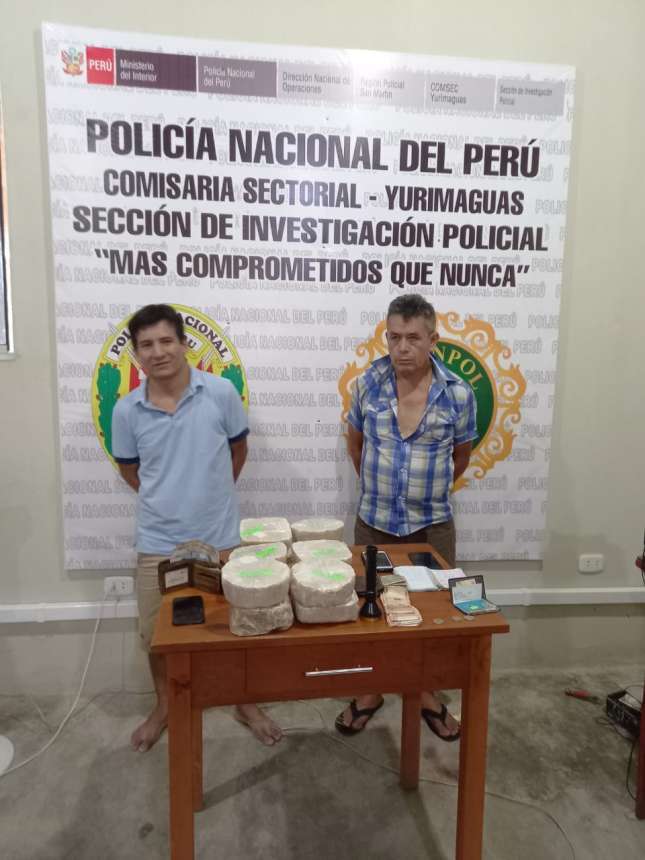 La Policía de la comisaría de Yurimaguas, capturó el sábado 23 de octubre de 2021 a dos presuntos traficantes de droga con 12 kilos de pasta básica de cocaína, en el interior del Hospedaje Pacucho.
