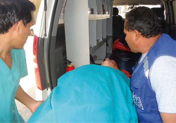 Con tres cortes en el cuerpo, el suboficial Del Águila llegó ensangrentado a la plaza de estacionamiento de Rústica, donde fue auxiliado por agentes del cuerpo de Serenazgo. El médico Juan Ruiz Soto, quien atendió al joven policía, le diagnosticó herida cortante y penetrante por agresión con arma blanca, situación que le afectó el abdomen derecho, y costilla, afectándole algunos órganos vitales. (Hugo Anteparra)